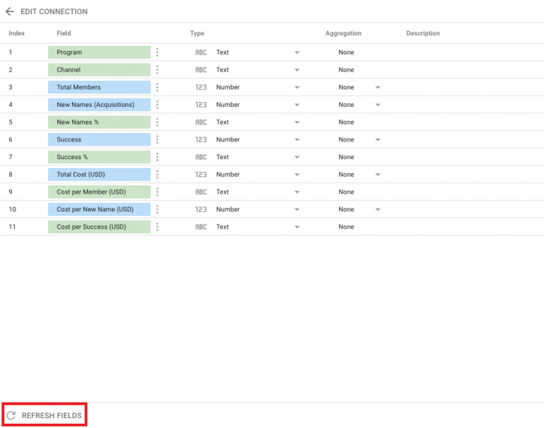 Nếu bạn cố ý thay đổi nguồn dữ liệu, hãy nhấp vào metric (chỉ số) hoặc dimension (thứ nguyên) hiển thị màu đỏ và chọn biến mong muốn trong nguồn dữ liệu mới. Nếu bộ lọc xuất hiện dưới dạng màu đỏ, bạn cần tạo bộ lọc mới dựa trên các trường của nguồn dữ liệu hiện tại. Nếu bạn chưa thay đổi nguồn dữ liệu, hãy kiểm tra cấu trúc của nguồn dữ liệu và cập nhật các trường nguồn dữ liệu ở cuối Data Studio bằng cách nhấp vào Làm mới trường trong chế độ xem chỉnh sửa trường nguồn dữ liệu. Nếu sự cố vẫn tiếp diễn, hãy kết nối lại với nguồn dữ liệu.