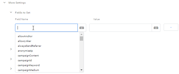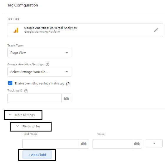 Fields to Set nằm trong ‘More settings’. Bạn có thể cài đặt chúng cho các tracking có tag type là Universal Analytics, Google Optimize,…