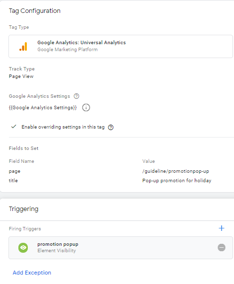 Field title sẽ cung cấp tiêu đề cho virtual page, cần phải ngắn gọn nhưng vẫn mang tính mô tả ví dụ như “Pop-up promotion for holiday”. Đảm bảo chọn đúng trigger để kích hoạt pageview ảo. Trình kích hoạt của bạn có thể là một lần pop-up hiển thị