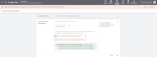 Khi bạn đánh dấu conversion action là “secondary”, thì conversion action được sử dụng để báo cáo trong cột “All conversion” trong báo cáo của bạn, nhưng không phải để bidding.