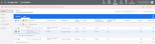 - Kiểm tra checkbox đối với conversion action mà bạn muốn xóa.