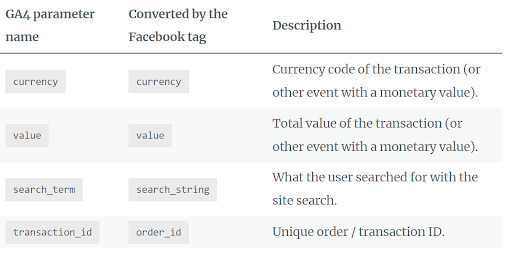 Vì vậy, nếu bạn sử dụng bất kỳ giá trị event name nào ở cột trái, Facebook sẽ chuyển đổi chúng thành giá trị tương ứng trong cột phải khi thu thập dữ liệu.