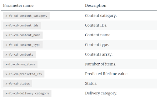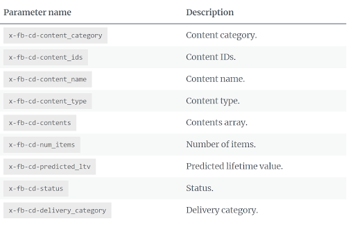 Tag server-side của Facebook có lượng giới hạn các parameter có thể sử dụng.