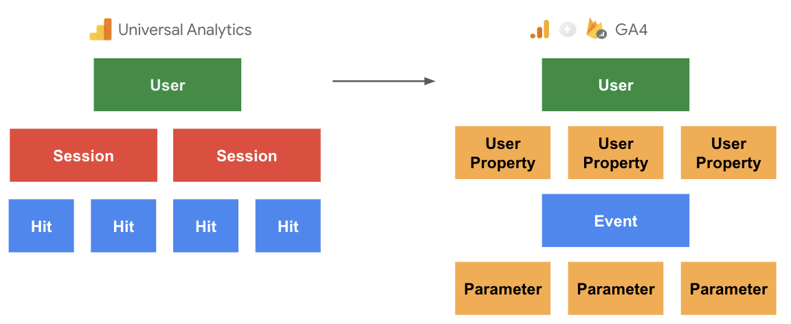 Một cải tiến lớn trong GA4 là khái niệm về phiên – session (một nhóm tương tác của user trong trang web) không còn “giới hạn” cách báo cáo và tạo mô hình dữ liệu. Trong GA4, sẽ có User Properties có thể được tận dụng để xác định phân khúc user, Events có thể theo dõi tương tác của user với trang web/mobile app và Parameters có thể được sử dụng làm siêu dữ liệu để đa dạng về event/interaction đang được tracking.