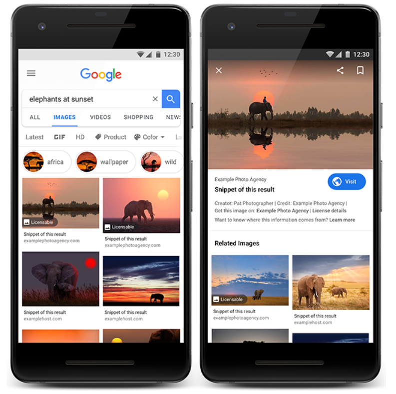 Khi bạn chỉ định bản quyền cho hình ảnh trên trang web của mình, hình ảnh thu nhỏ đó sẽ hiển thị kèm theo nhãn “Licensable” trong Google Image. Nhãn này cho mọi người biết rằng hình ảnh nào có thông tin giấy phép, đồng thời cung cấp đường dẫn đến giấy phép trong Image Viewer để người dùng xem thêm chi tiết về cách họ có thể sử dụng hình ảnh.