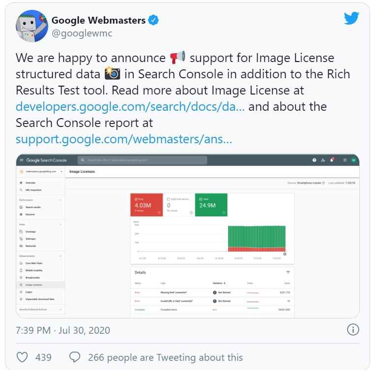 Google tiến hành cập nhật Search Console với  báo cáo Image License để hỗ trợ hình ảnh chứa cấu trúc dữ liệu, điều mà hiện tại có thể kiểm tra với công cụ Rich Results Test. Nó được sử dụng để chỉ ra liệu một hình ảnh cụ thể có bản quyền hay không. Tại đây chủ trang web sử dụng báo cáo Image License để biết chính xác tần suất thông tin hình ảnh được cấp phép của họ sẵn sàng trình bày cho người tìm kiếm.