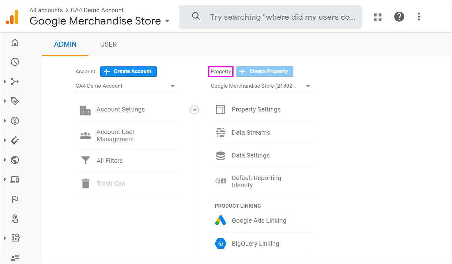 Cấu trúc tài khoản Google Analytics 4 chuyển thành cấp thuộc tính (property level). GA4 không tương đương trực tiếp với các chế độ xem GA Universal (GA Universal views).
