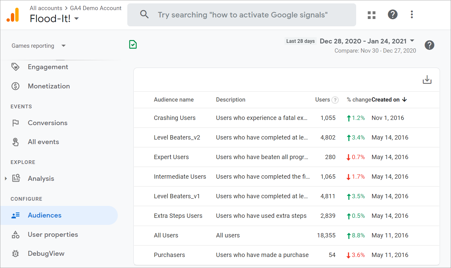Flood-It! property giúp Android, iOS và website về games tạo báo cáo về: gaming events, conversions, user properties và audiences