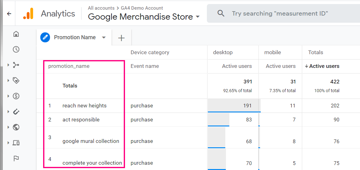 Một Custom Dimension như vậy trong Google Merchandise Store property là Promotion_name.