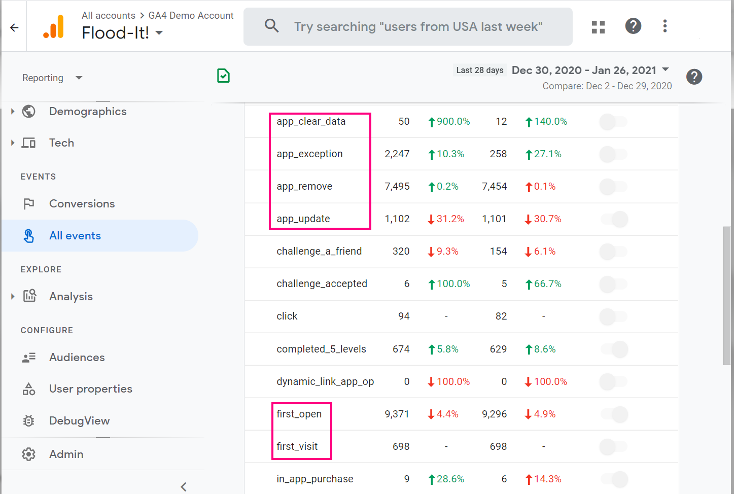 GA4 tự động thu thập một loạt các events khi được triển khai cho các mobile app và / hoặc web. All Events report hiển thị các sự kiện này và các thông số liên quan cùng với các custom events được ghi nhận… hoặc nhóm thực hiện Flood It! trong trường hợp này.