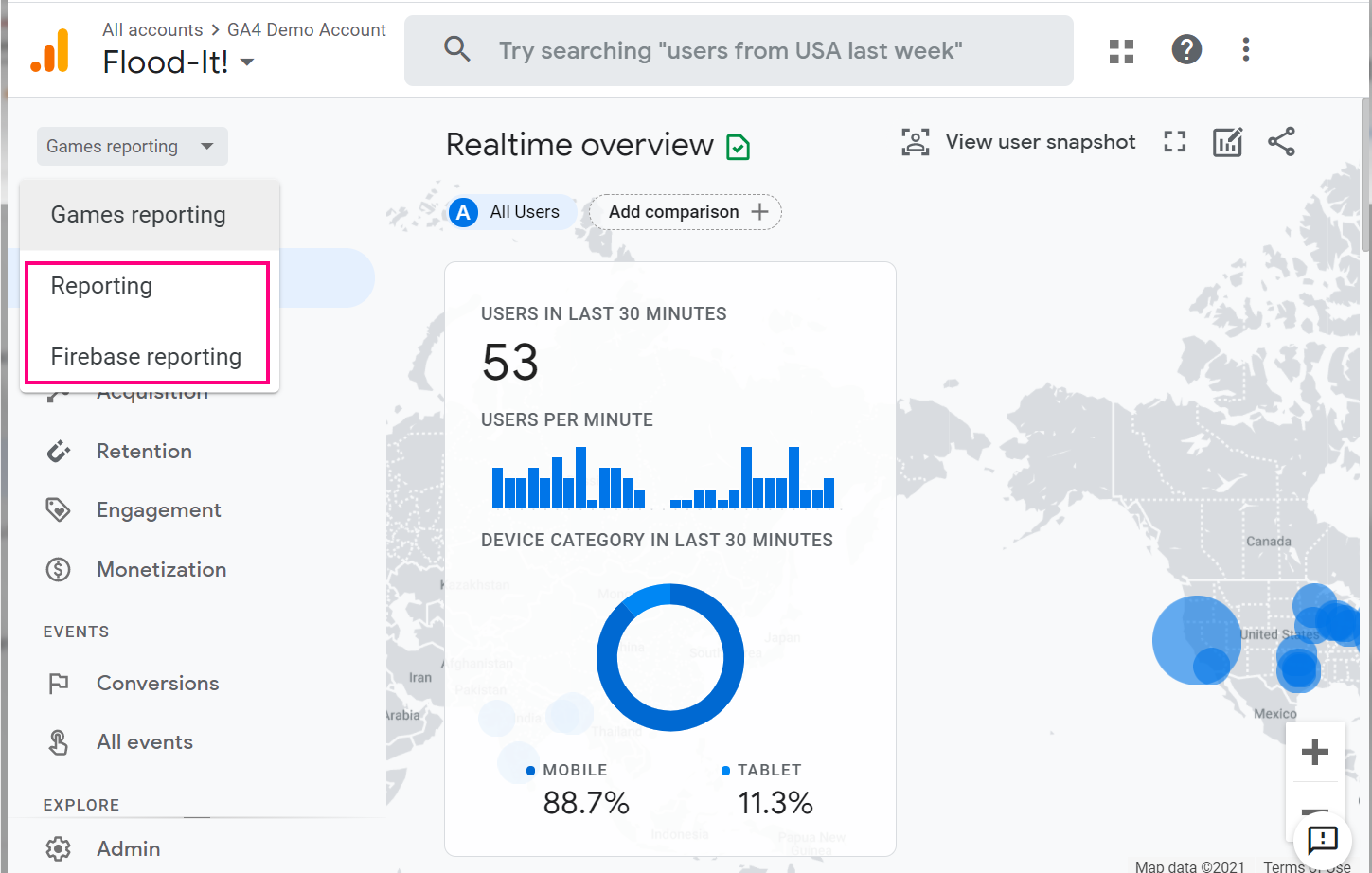 Báo cáo mặc định được đặt trong Flood It! property là Games Reporting. Hãy đảm bảo chuyển đổi giữa các bộ Games Reporting, Reporting, và Firebase Reporting để xem các báo cáo khác nhau có sẵn. Firebase Reporting đặc biệt cung cấp một số báo cáo chuyên biệt, chẳng hạn như Crashlytics, để hiểu hiệu suất mobile app.