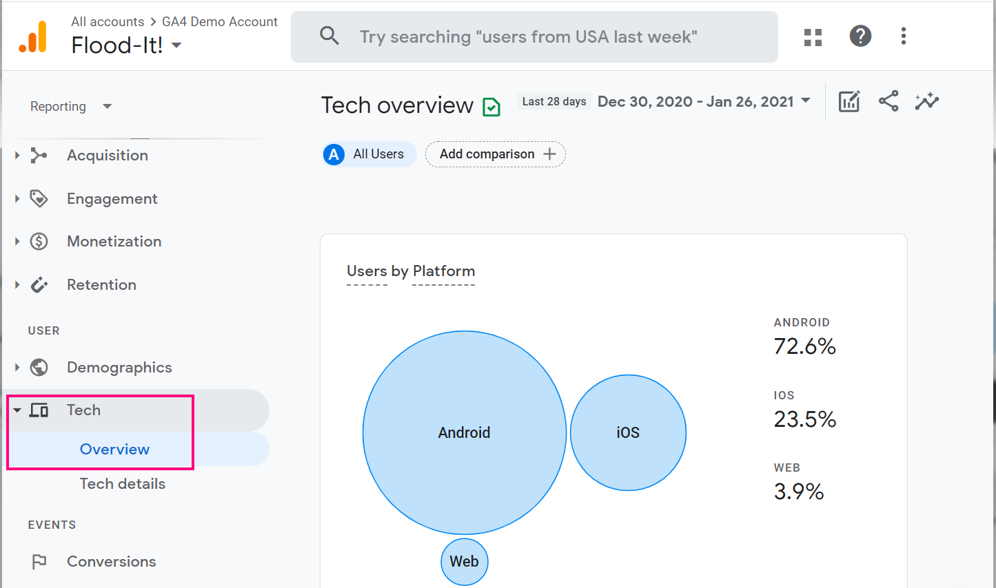 Mô hình dữ liệu hợp nhất cho các luồng dữ liệu Android, iOS và web đóng vai trò là nền tảng của GA4. Điều hướng đến Tech > Overview để xem phần trăm user được ghi nhận trong mỗi data stream.