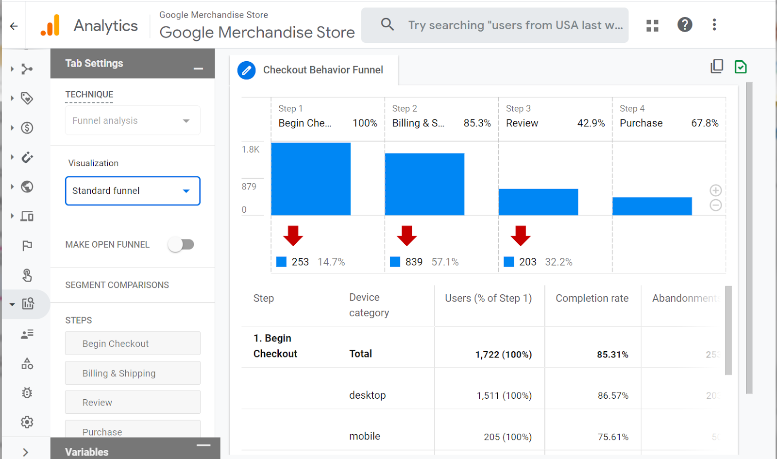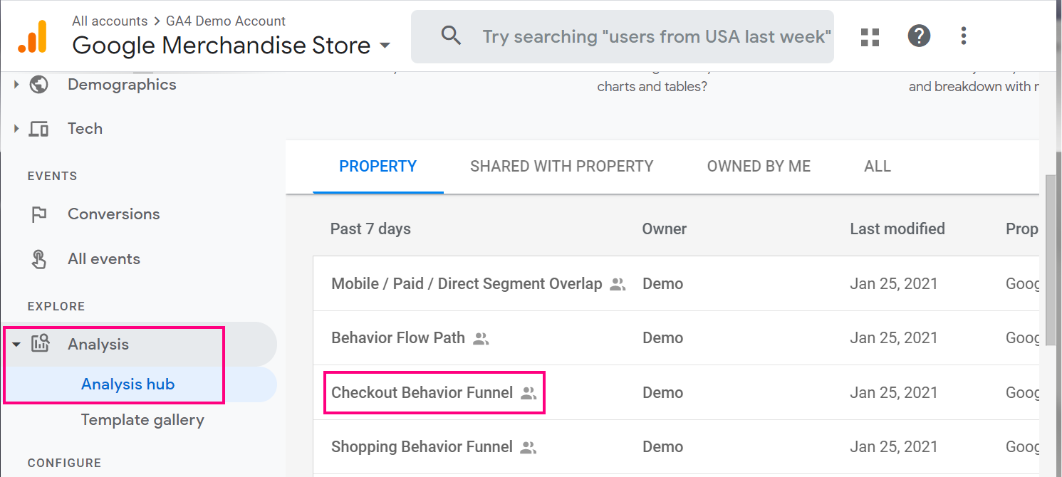 Có thể truy cập các mẫu report bằng cách nhấp vào Analysis > Analysis Hub trong điều hướng bên trái. Một số phân tích, bao gồm Checkout Behavior Funnel, đã được chia sẻ trong Google Merchandise Store property.