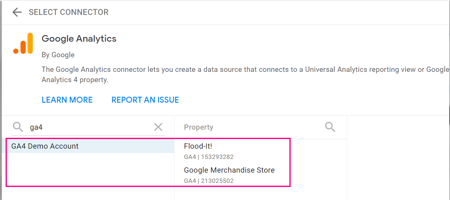 Có thể sử dụng GA4 demo properties làm nguồn dữ liệu trong Data Studio.