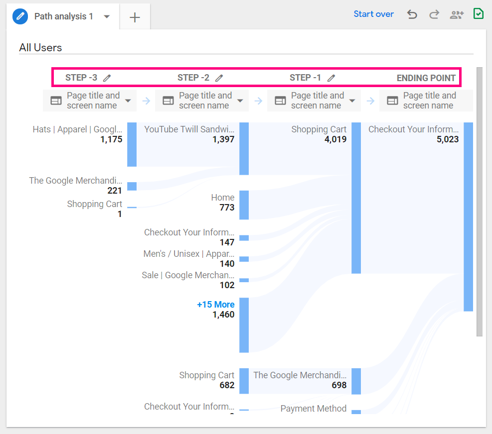 Định dạng Path Analysis mới hiển thị luồng tương tác của user về pageviews hoặc tất cả các events. Nhấp vào Start Over để cấu hình Ending Point Path Analysis.