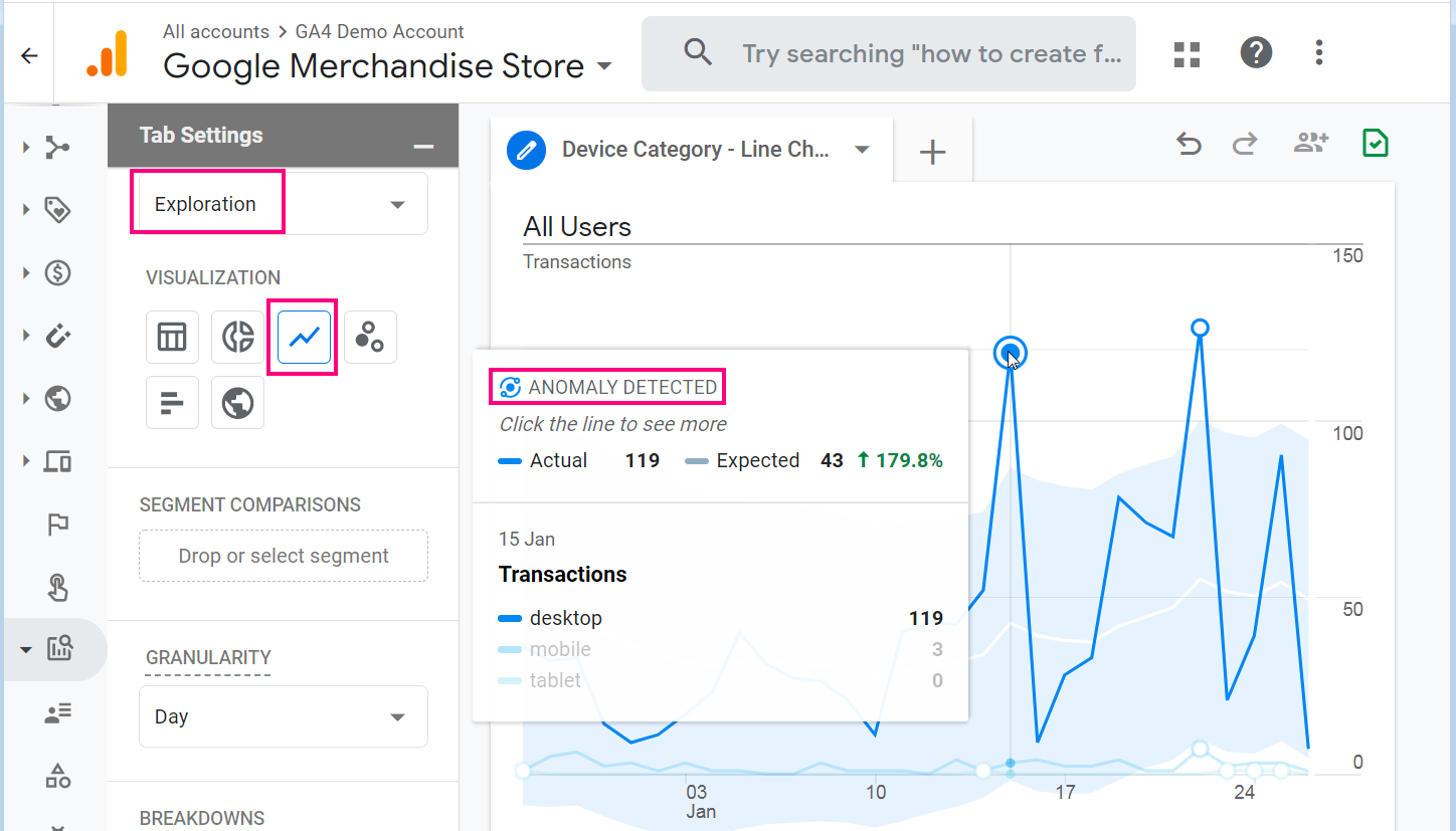 Line Chart áp dụng trong Exploration với tính năng phát hiện những điểm bất thường bởi machine-learning cần được chú ý đặc biệt.