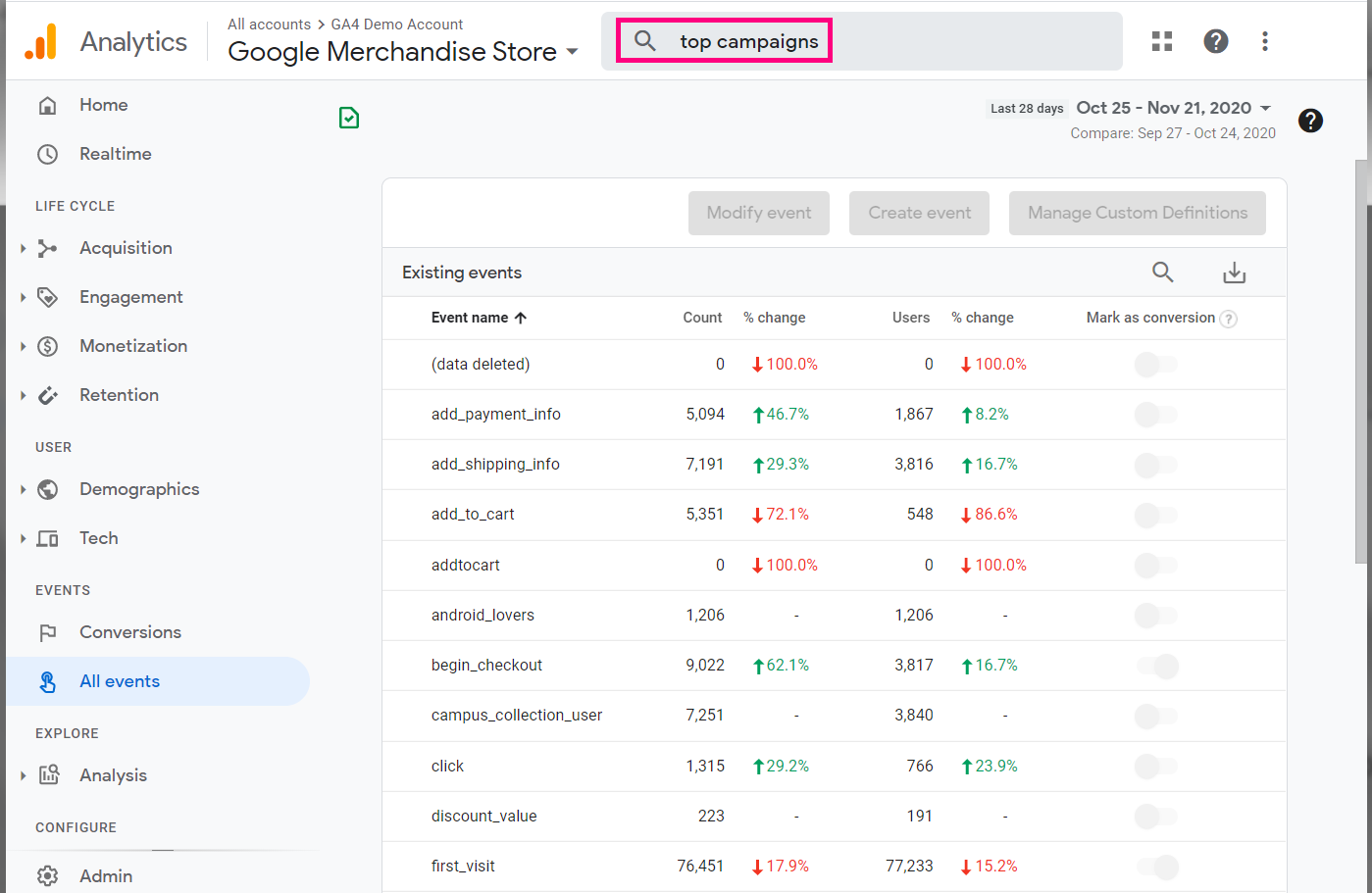 Hầu hết các báo cáo chính từ Google Universal Analytics cũng có sẵn trong GA4, nhưng với tên khác và giao diện khác. Tùy chọn Customize Report có sẵn trong nhiều báo cáo GA4 cho phép xác định các Comparisons, tương ứng khá chặt chẽ với các custom segments trong Universal.
