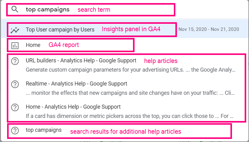 Tính năng tìm kiếm trong GA4 trả về nhiều kết quả khác nhau, bao gồm thông tin chi tiết, báo cáo tích hợp và nhiều bài viết trợ giúp.