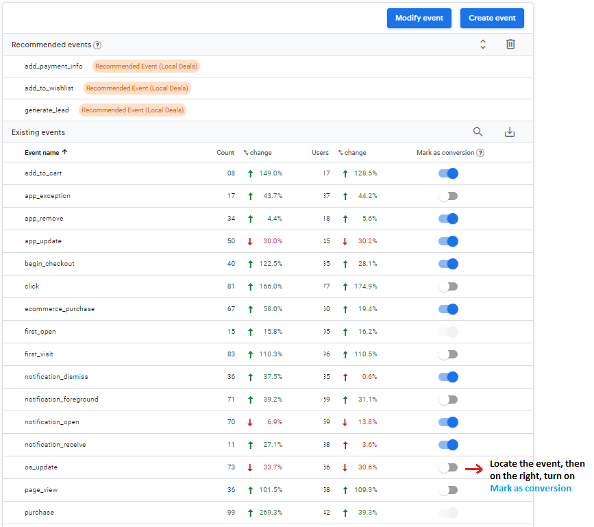 Danh sách cách event được chỉ định là conversion sẽ được hiển thi tại báo cáo Convensions