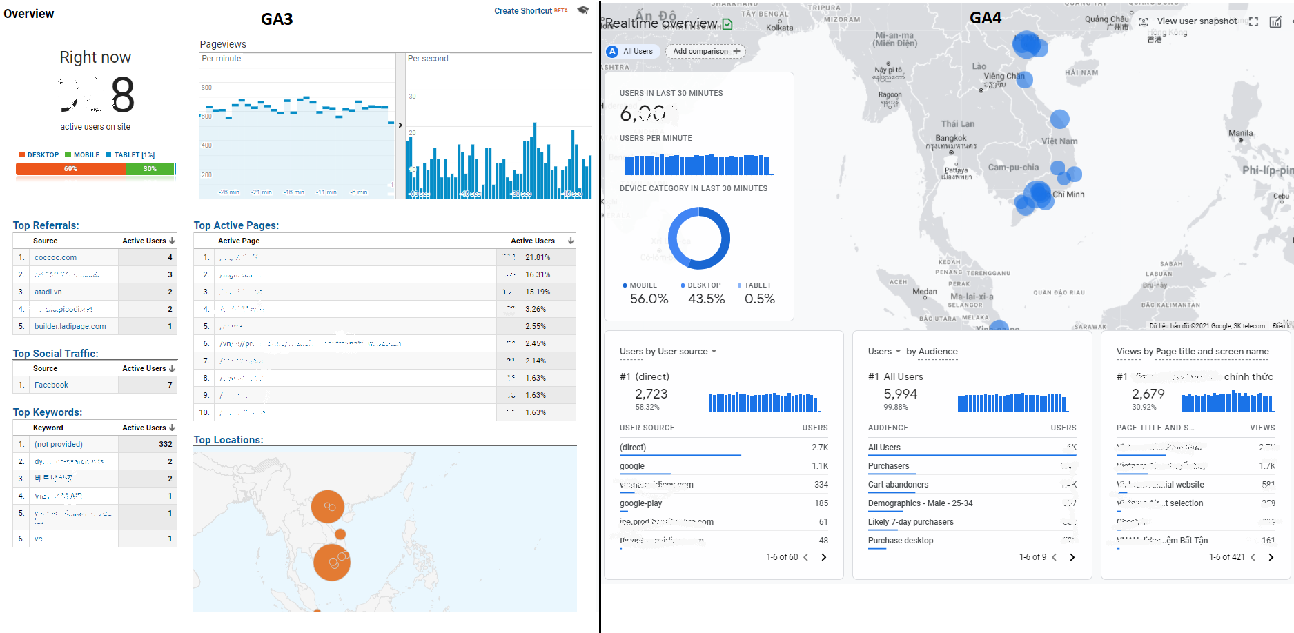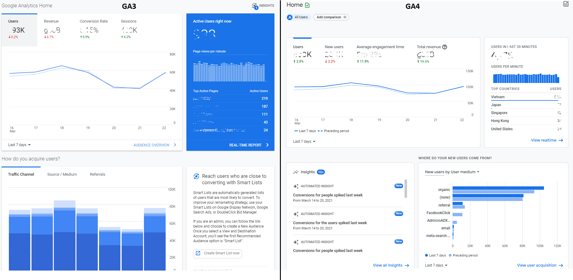 Giao diện của GA3 và GA4 hoàn toàn khác nhau trên tất cả các báo cáo, do đó Google có lời khuyên bạn nên quen dần với GA4 trước khi phiên bản chính thức được ra mắt. Nếu so về số lượng báo cáo GA4 sẽ ít báo cáo hơn hẳn GA3 như Landing Page, Site Speed, Frequency & Recent, Sale Performance,…..