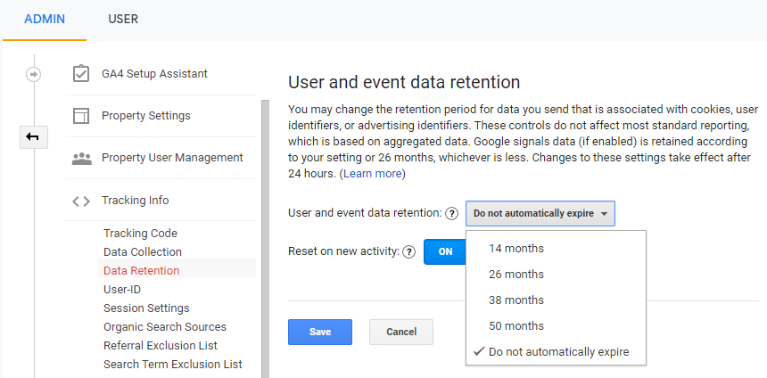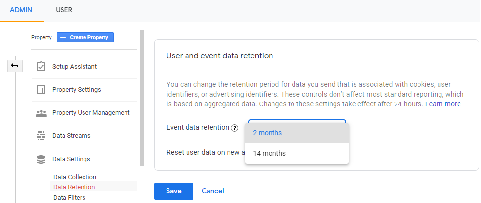 Tính năng “User and event data retention” được dùng để set thời gian mà GA lưu trữ dữ liệu của user trước khi tự động xóa
