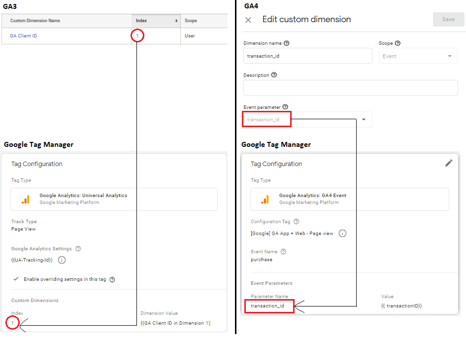 Custom dimension và metric được GA3 cung cấp 1 mã định danh (index) khi tạo mới và mã này sẽ được sử dụng trong cấu hình tag GTM để đẩy dữ liệu về GA3. Trong khi đó GA4 sẽ yêu cầu nhập parameter event và chúng cũng sẽ được cấu hình trên tag GTM để đẩy dữ liệu về GA4