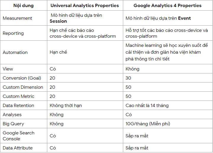 Dưới đây là phần tổng kết các điểm khác biệt của GA3 và GA4: